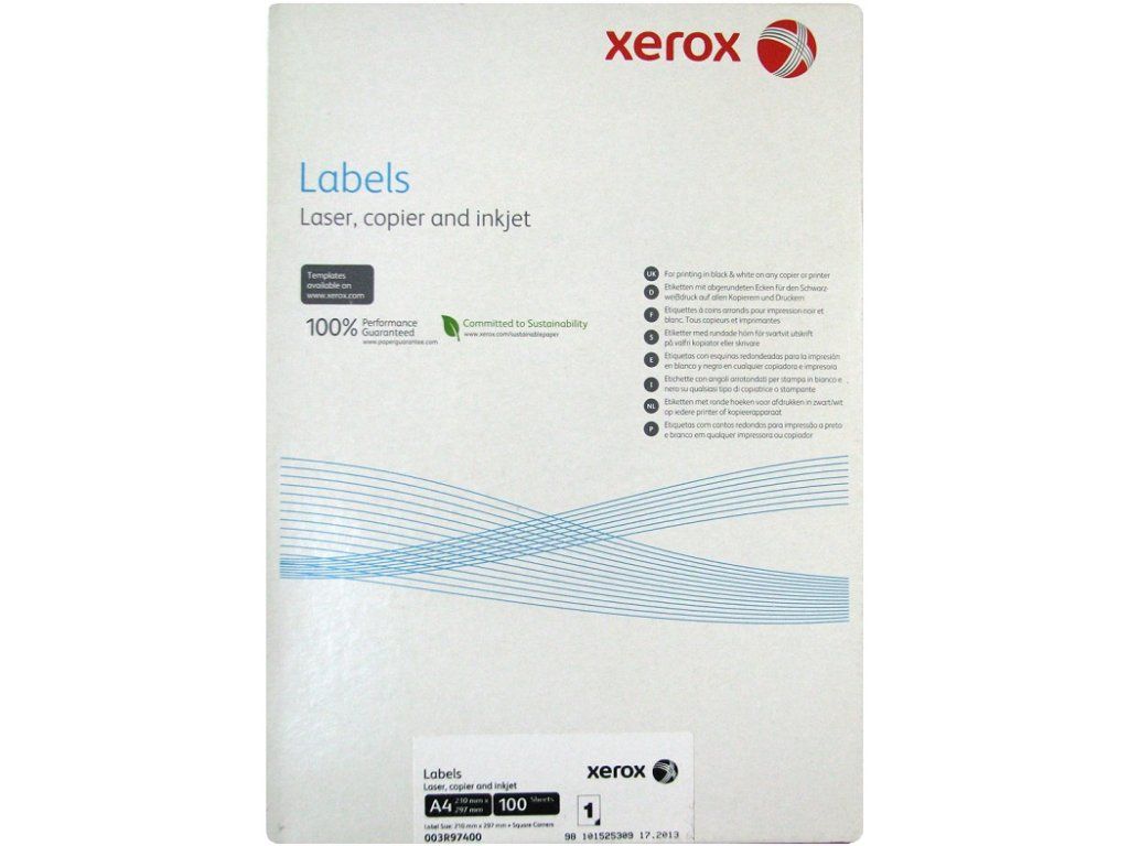 Xerox Papír - Bílé samolepicí štítky pro černobílý tisk - ostré rohy ( Labels 1UP 210x297, 100 listů, A4)Dodatočné parametre