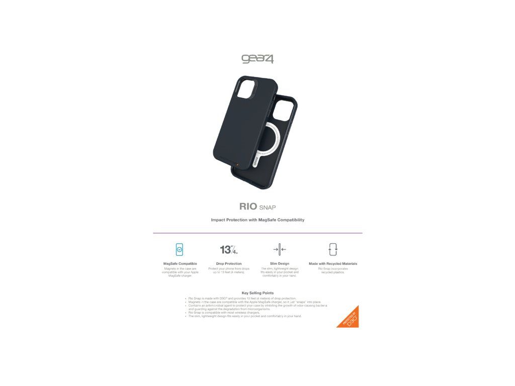 Ochranný kryt kompatibilní se systémem Apple MagSafe. Kryt je vyroben z materiálu D3O®, díky kterému vaše zařízení ochrání při pádech z výšky až 4 metrů. Kryt je navíc obohacen o antimikrobiální vrstvu RepelFlex™. Ochranný kryt Gear4 Rio Snap je kompatibilní s MagSafe. Díky zabudovaným magnetům kryt k nabíječkám a ostatnímu příslušenství dokonale přilne, to zajistí stabilní nabíjení a ničím nerušené používání ostatního příslušenství.