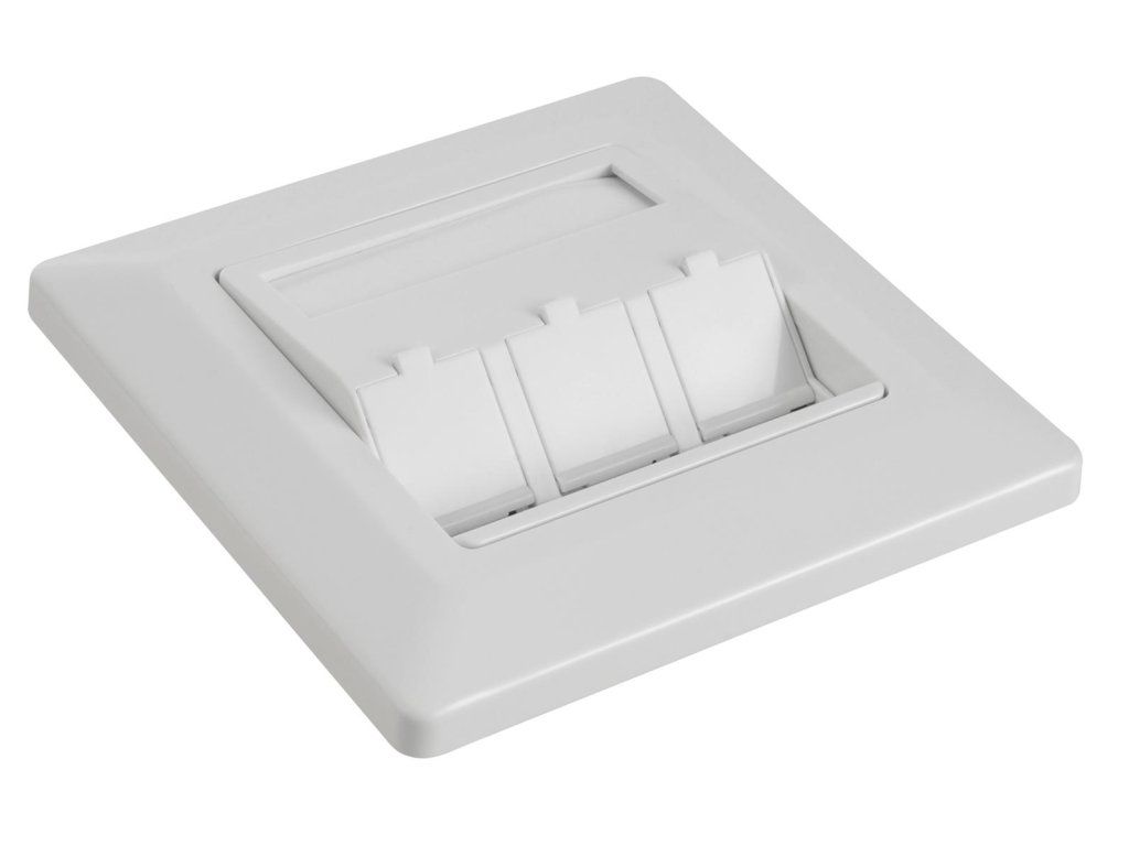 SPECIFIKACE • Počet portů: 3 • Stínění: ne • Určení: Pod omítku, s boxem na omítku • Úhel portů: 45° • Modulární provedení: ano • Barva: bílá • Rozměry: 80 x 80 mm • Skladovací teplota: -40 až 70°C • Provozní teplota: -10 až 60°C • Max. provozní vlhkost: 93%